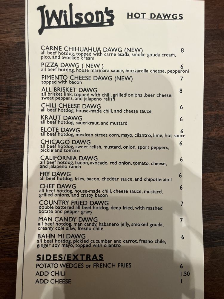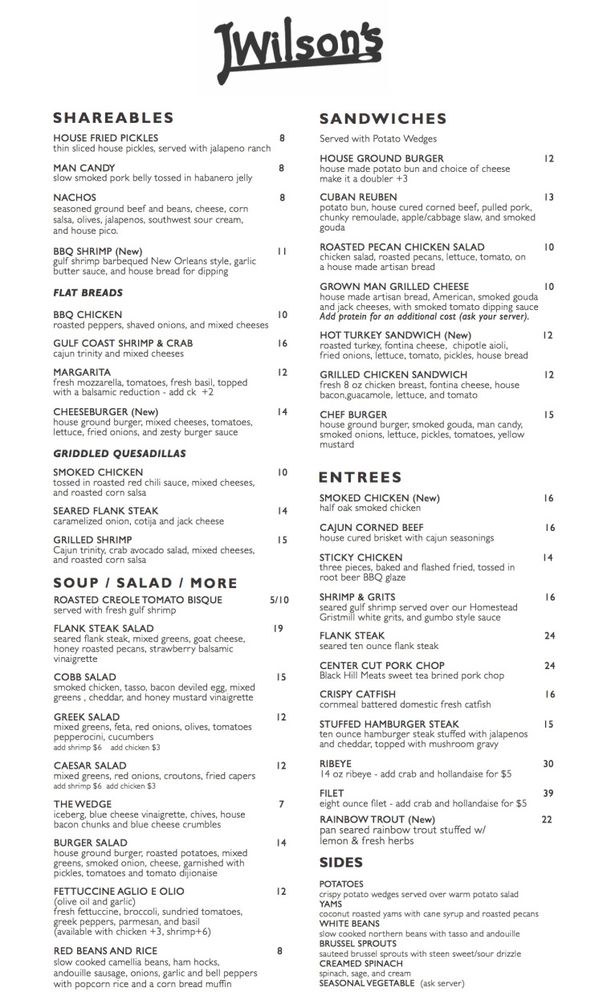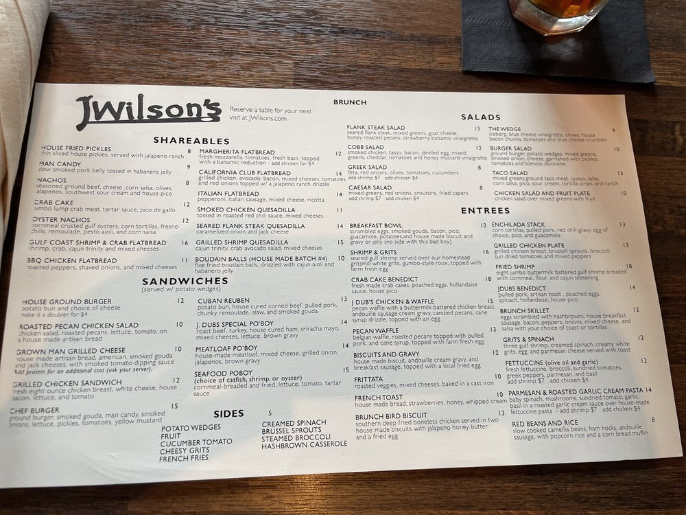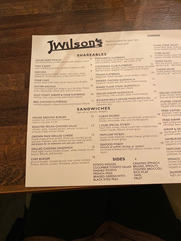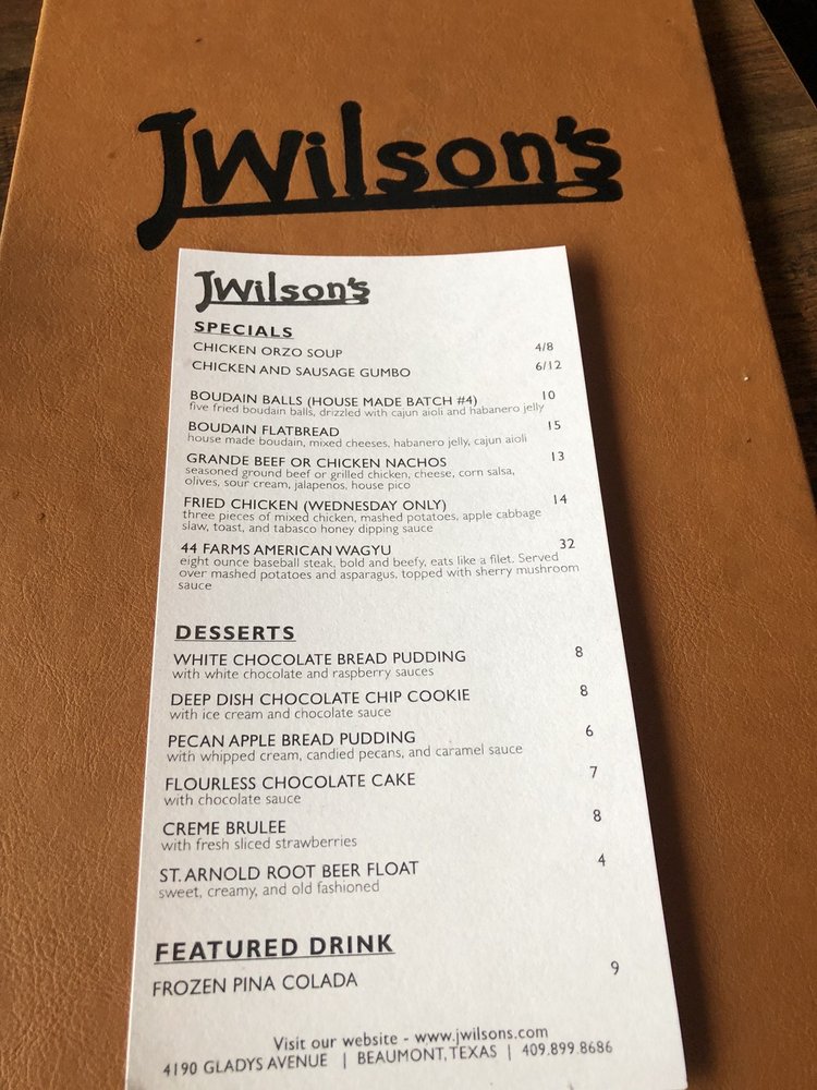 J. Wilson's is a New American restaurant located in Beaumont, TX, offering a diverse menu of sandwiches and bar fare. With a casual yet upscale atmosphere, J. Wilson's provides a range of options for vegetarians and accepts various payment methods, including Apple Pay. The restaurant caters to families, groups, and even allows dogs on the outdoor seating area. Customers rave about the excellent service and delicious food, with standout dishes like hot dawgs, elote, man candy, kraut dawgs, creamed spinach, boudin balls, and boudain nachos receiving high praise. Overall, J. Wilson's is a must-visit dining establishment known for its inviting ambiance, tasty dishes, and top-notch service.